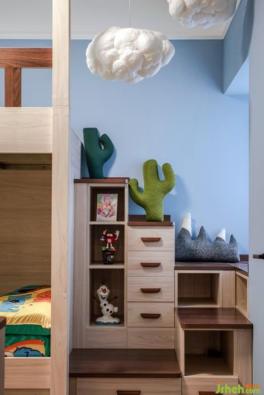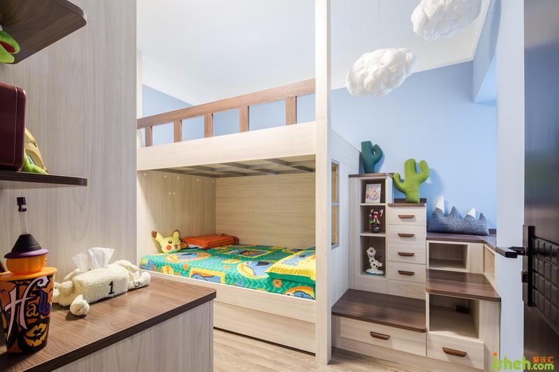 小孩房為節(jié)省空間,采用了上下鋪設(shè)計,利用了飄窗臺做了個異性轉(zhuǎn)角臺階,增加了空間的趣味性。