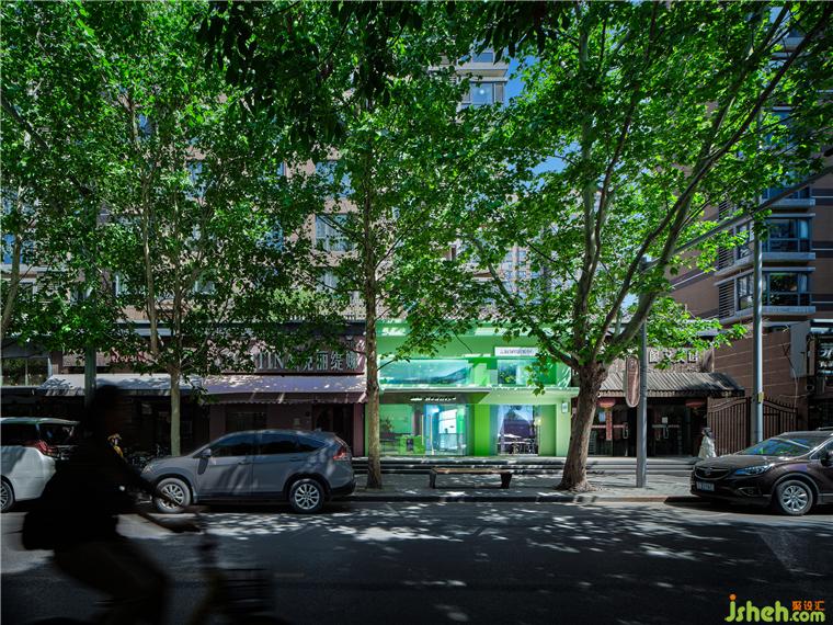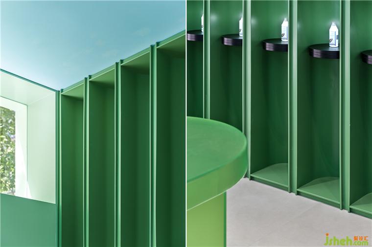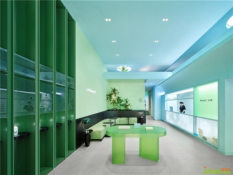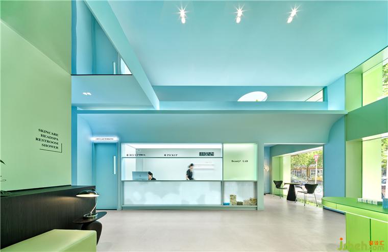目前市面上大部分的美業(yè)空間都以米白、木色,黑白為主,國(guó)內(nèi)尚無美業(yè)品牌占有強(qiáng)烈的空間色彩IP。因此我們決定大膽運(yùn)用Beauty π云朵白的VI色以搶占第一個(gè)空間色彩IP。主VI色應(yīng)用于外立面及小部分室內(nèi)空間,給人以綠色的第一品牌印象。療膚中心設(shè)計(jì)輔助色藍(lán)色大面積應(yīng)用于室內(nèi)公共空間,與綠色中和,達(dá)到自然、清爽、安靜的感受。