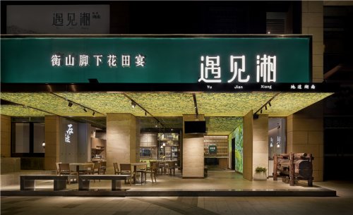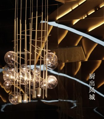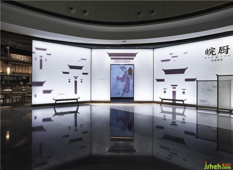 皖廚桃花潭外立面運(yùn)用整面玻璃燈光外墻,國畫寫意結(jié)合現(xiàn)代燈光設(shè)計(jì),繪制抽象徽派建筑線條。餐廳內(nèi)沿用徽派建筑馬頭墻墻體,并于高地懸掛紗幔以聲光電技術(shù)投影桃花瓣飄落場景,室內(nèi)多以中式園林框景手法結(jié)合燈光設(shè)計(jì)繪制陰翳感,金磚地面營造出水的倒影,拉伸空間的維度。深圳餐廳設(shè)計(jì)