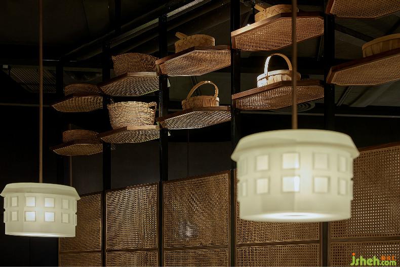 傳統(tǒng)手工藝制品是民間智慧和生活溫度的結(jié)晶。來自山中的藤類植物,經(jīng)由粗糙卻靈巧的雙手,成為隨處可見精美的盛具器皿。網(wǎng)格藤椅、卡座后方的藤編裝飾、明檔上方的藤編弧形隔板,傳統(tǒng)工藝品與現(xiàn)代設計材料結(jié)合混搭,得到重生。餐廳設計呼應“遷移”和“融合”的客家文化主題。