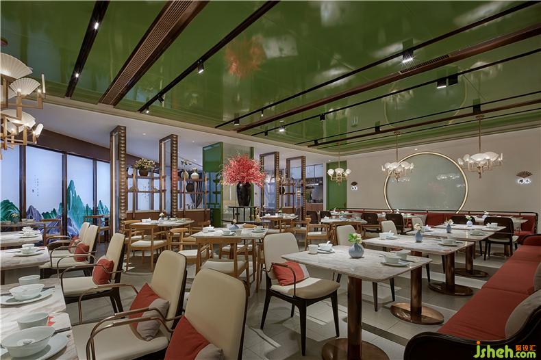 過狹長的甬道,步入餐廳的瞬間視線豁然打開,別有洞天。飽和、濃郁的綠色紅色撲面而來,餐廳設(shè)計(jì)與陳設(shè)飾品的搭配使人眼前一亮,整個空間充滿活力,生機(jī)盎然。綠色的烤漆鋼板天花突破了在傳統(tǒng)湘菜餐廳中固有的色彩認(rèn)知,定制的折扇型的吊燈打破了空間的沉悶,成為視覺中心。