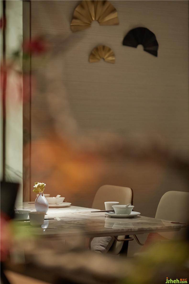 與之相呼應(yīng)的是墻面的搭配的扇面造型飾品和湖南著名景觀的照片墻,餐廳設(shè)計(jì)以及誤入桃花源的中國水墨畫無一不詮釋著創(chuàng)作的主線:為食客提供一個優(yōu)雅就餐的”世外桃源”。