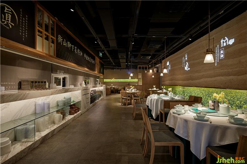 餐廳夯土墻上的投影重現(xiàn)衡山鄉(xiāng)下的榨油場景,與背景墻、食材介紹相映成趣。餐廳設(shè)計(jì)