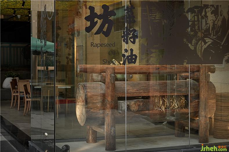初至「遇見湘」祈福店,一片金燦燦的油菜花海充滿眼簾并延伸室內(nèi),門前花海下放置著一具手工木質(zhì)古法榨油機(jī),兩側(cè)整齊地堆疊著菜籽油餅,吸睛的同時力圖傳遞出匠心、傳承的理念,餐廳設(shè)計(jì)也通過這兩個代表性的符號傳遞出定位的訴求:衡山腳下菜籽油,炒出地道湖南味。