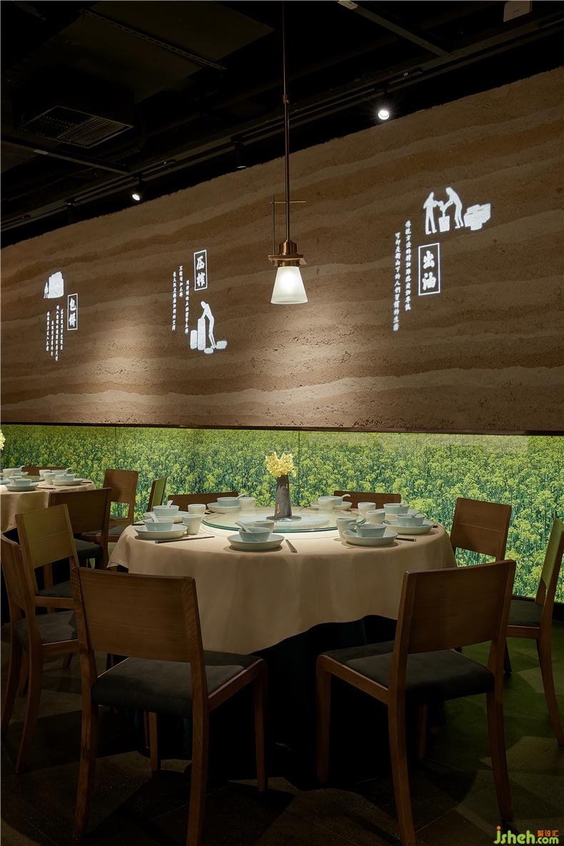 而為凸顯好油炒好菜,菜籽油的古法手工制作流程也被設(shè)計(jì)師用巖畫的手法加以呈現(xiàn),餐廳設(shè)計(jì)并通過投影形式映射在空間夯土墻上。夯土,這是油菜種植的土壤,是砌墻的土,亦是隱匿地道湖南味的沃土。