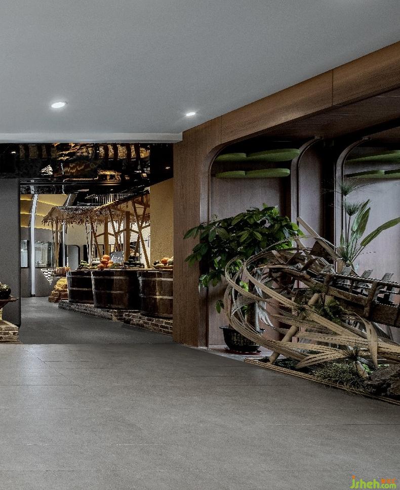 區(qū)域的隔斷采用夯土磚結(jié)合茅草屋的形式,餐廳設(shè)計(jì)既增加了空間就餐的隱私性,又能作為食材的展示臺(tái),上面陳列著順德家家必備的佐料食材,如嫩子姜、臘肉等等。