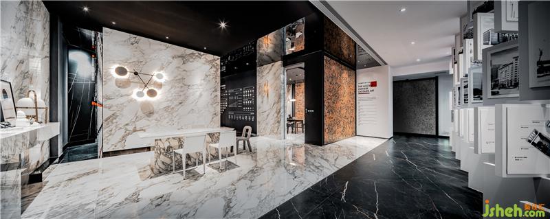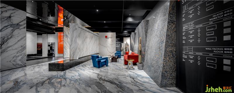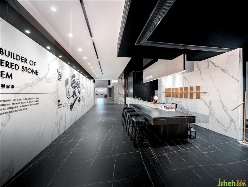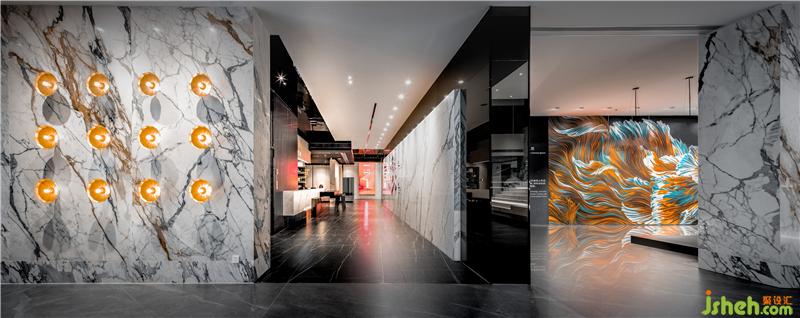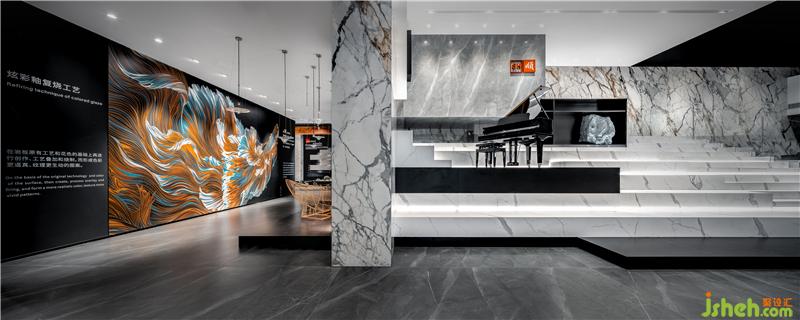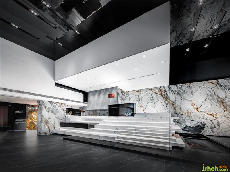 《桃花源記》有云,“初極狹,才通人。復(fù)行數(shù)十步,豁然開朗?!表樰x巖板展廳入口平緩,進(jìn)入大堂,有豁然開朗之感。層高7 米,天花飾以黑色不銹鋼鏡面,延拓空間,弱化其他材質(zhì)的存在感。譬若國(guó)畫所講求的計(jì)白當(dāng)黑——一紙筆落,留白三分,韻味悠長(zhǎng),以內(nèi)斂空間凸顯展陳效果展廳裝修設(shè)計(jì)。