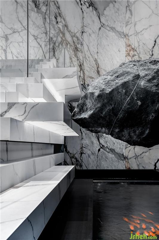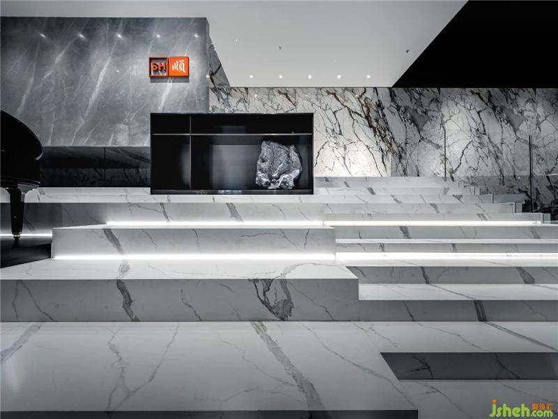 大堂是藝術(shù)的舞臺(tái)。順階而上,巖板于階梯的正側(cè)面形成自然連紋,堪為神斧天工。上墻、落地,產(chǎn)品極為熨帖地呈現(xiàn),不爭(zhēng)不搶,恰到好處。一方水景,懸掛著粗獷的巖石裝置,不規(guī)則樓梯營(yíng)造出山石嶙峋之狀,自然意態(tài)的細(xì)膩描摹,契合了順輝巖板“取法自然”的初心。游走大堂,庭院理水,堆山疊石,頗得中式園林欲藏于露的妙趣也伸著展廳裝修設(shè)計(jì)。