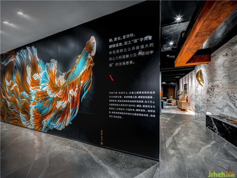 中國傳統(tǒng)文化是根,古為今用,創(chuàng)新再造,方能一展經(jīng)典之美。入展廳,一尾色彩斑斕的鯉魚栩栩如生,魚身舒展上游,裙尾層層疊疊,體態(tài)流線、輕盈。這是順輝巖板聯(lián)手藝術(shù)家陳健珊創(chuàng)作的巖板壁畫“順鯉成章”。它納入銅鑿剪紙的非遺文化技法,在大漆系列巖板的基礎(chǔ)上,采用炫彩釉復(fù)燒。一側(cè)置有同樣來自佛山民間藝術(shù)社創(chuàng)作的竹編船只裝置,靈動(dòng)自然,呼應(yīng)在地文化深圳裝修設(shè)計(jì)。