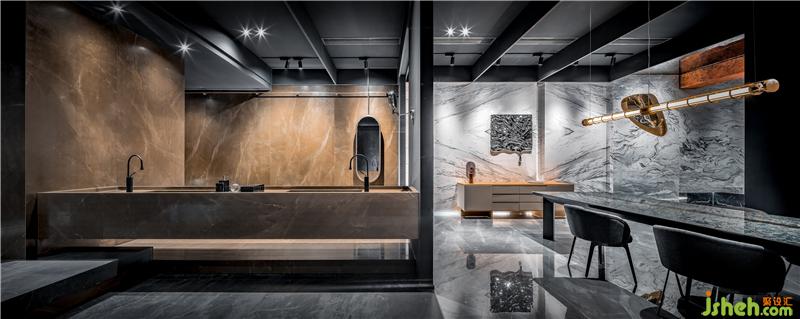 以電影中的長鏡頭手法解構(gòu)空間,形塑明晰動(dòng)線——不折返,一“鏡”到底。墻及地面運(yùn)用不同巖板,區(qū)隔出客廳、餐廳、廚房、衛(wèi)浴、選材區(qū)、洽談區(qū)的不同場域??蛷d的對紋電動(dòng)門、客餐區(qū)的小園景、餐衛(wèi)的色調(diào)銜接……力求介入設(shè)計(jì),將場景轉(zhuǎn)換消弭于無形,讓觀者沉浸式地體驗(yàn)其中。