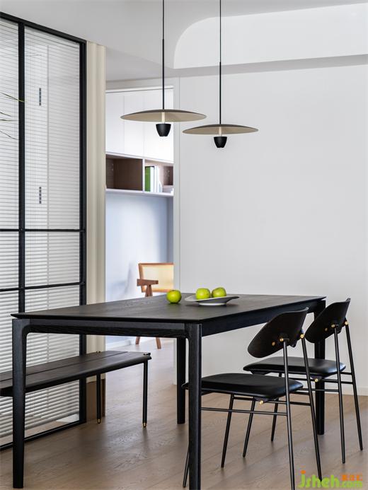 黑色餐桌與原木色地板,海境界家裝設計既不會讓空間產(chǎn)生壓抑之感,又不會讓配色過于單調(diào)