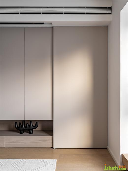 客廳沒有放置電視,海境界家裝設計主墻做了一大面儲物柜,可以收納很多家庭雜物以及小孩的書籍玩具,兩側(cè)為兩扇大的推拉柜門,小孩拿書籍玩具會比較方便,頂部中央空調(diào)處有安裝投影幕布,雖然沒有電視偶爾看看電影還是很舒適