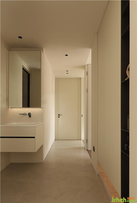 整個(gè)過(guò)道,利用公衛(wèi)二次分離的衛(wèi)生間外置洗手臺(tái),深圳家裝設(shè)計(jì)盡顯空間尺度感,各私有空間的房門無(wú)框隱形到頂,將極簡(jiǎn)利落到更極致。