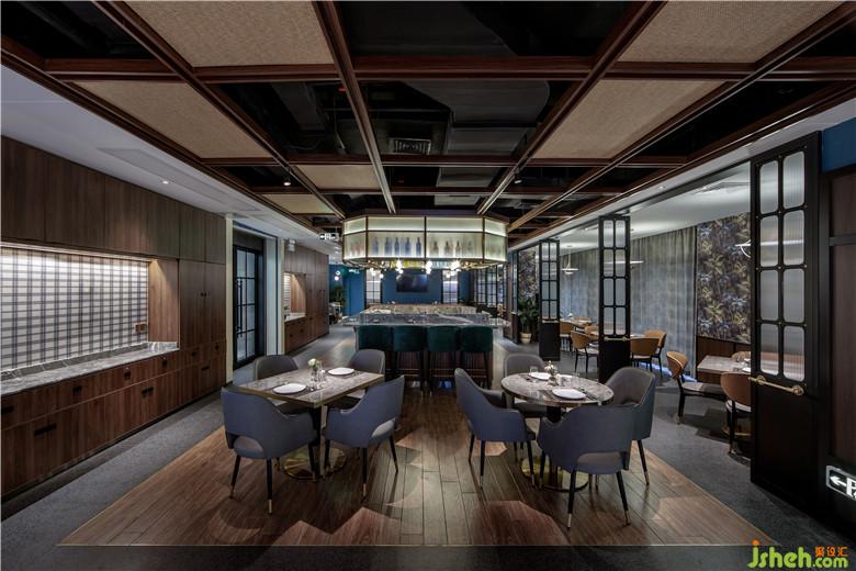 空間整體使用自然的材料搭配機理藝術(shù)漆,包括桌子和酒吧吧臺造型使用的胡桃實木木、皮革座椅、定制鐵藝屏風上的拋光銅制品以及波浪紋工藝玻璃、廚房區(qū)域的藏藍色方格瓷磚和啞面水磨石地板。藍色調(diào)復古花藝墻布裝飾著餐廳內(nèi)特定的幾面墻壁。帶有不同區(qū)域分布的編藤天花造型擴展了餐廳的視野。保留原有外窗,周邊布置就餐位置,最大化餐廳內(nèi)部光線的投入以及用餐人員的景觀視野。