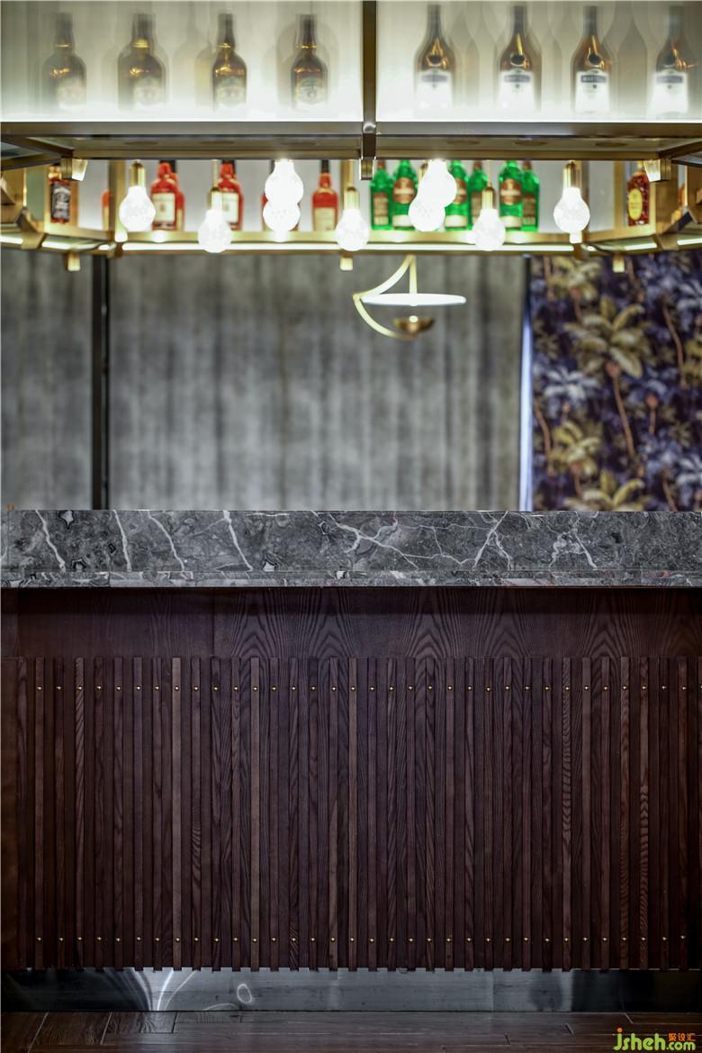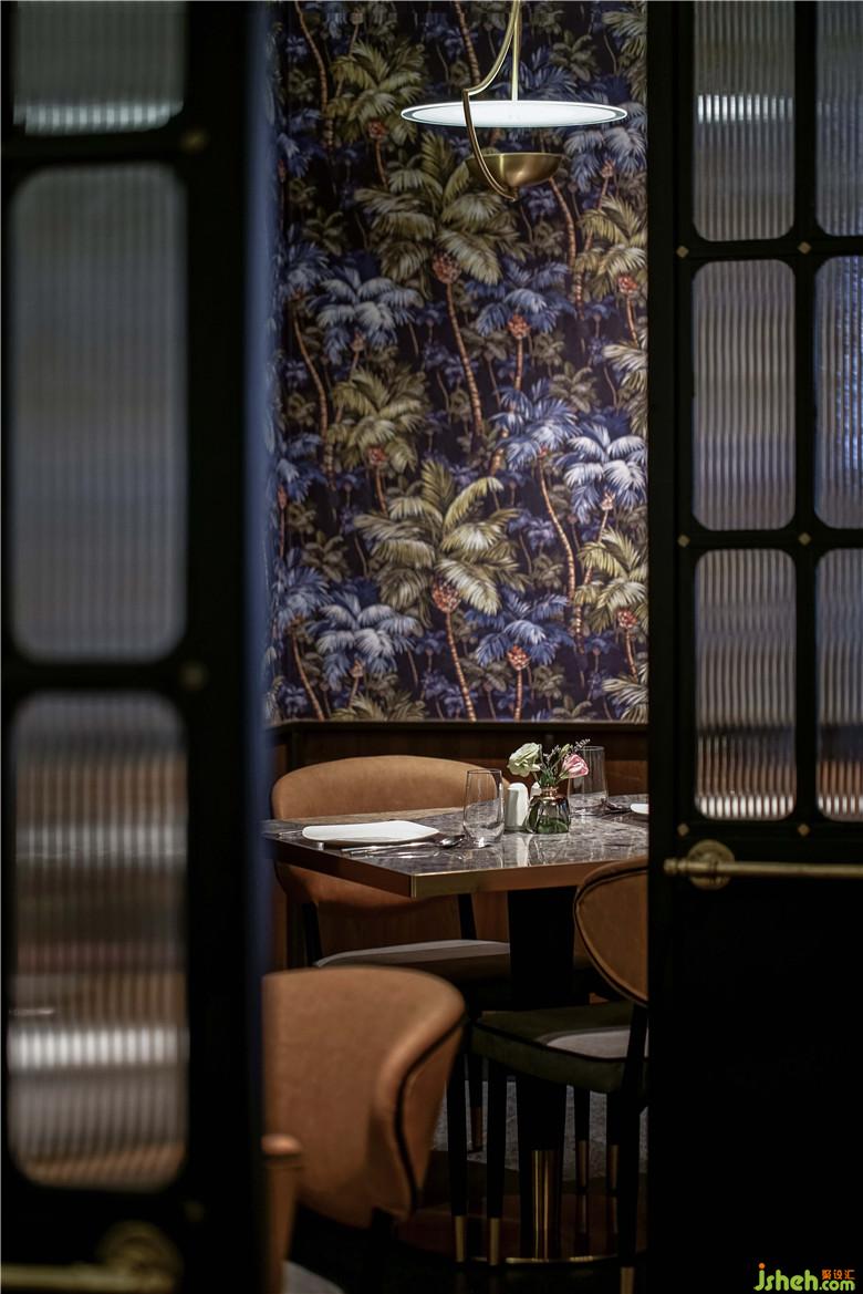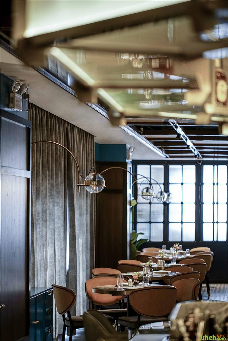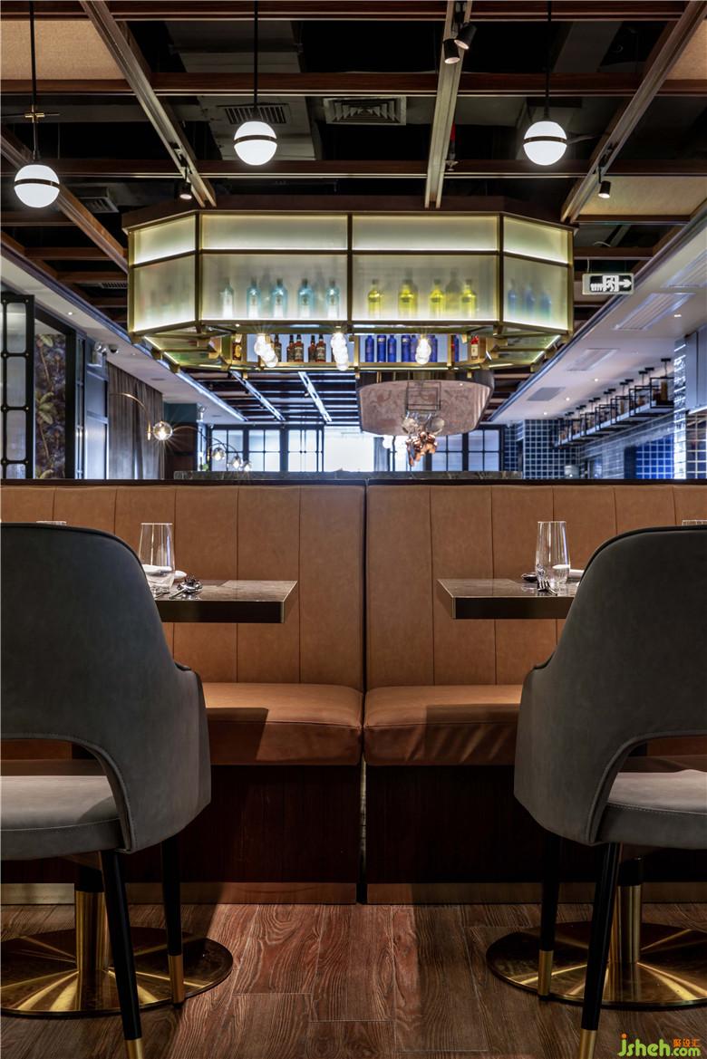 編藤木條邊框造型的天花以及裝有藝術(shù)玻璃的黃銅酒架,漂浮在酒吧區(qū)域上方,在餐廳內(nèi)部區(qū)域有限的高度下盡量延展空間的高度。約50塊個手工制作的方形編制框架固在定制的木色鋁條鋼軌上,縱向貫穿整個天花區(qū)域。這一強有力的空間元素有助于延展空間、吸引餐廳內(nèi)外的視線延伸。通過酒吧上方的發(fā)光酒架橫向切斷,用餐視野得到進一步提升,讓來自吧臺的活力滲透到兩方的用餐環(huán)境。