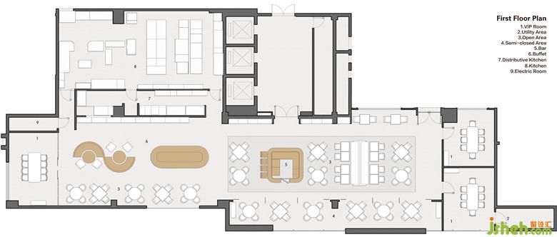 黑色鐵藝屏風(fēng)造型更近一步的強(qiáng)調(diào)了復(fù)古情調(diào)的延展性。制造門洞的構(gòu)式作為兩個(gè)用餐區(qū)域的劃分布置。內(nèi)部里,整體上使用藍(lán)色花藝墻布來呼應(yīng)設(shè)計(jì)師對(duì)重回歷史這個(gè)主題所切入的歷史感。同時(shí),深色系胡桃木墻裙跟絨布窗簾也給予了客戶一種溫暖的用餐經(jīng)驗(yàn)。希望將通過這個(gè)劃分幫助空間制造更多的層次。形成一個(gè)更有特色的景觀就餐區(qū)域。餐廳設(shè)計(jì)