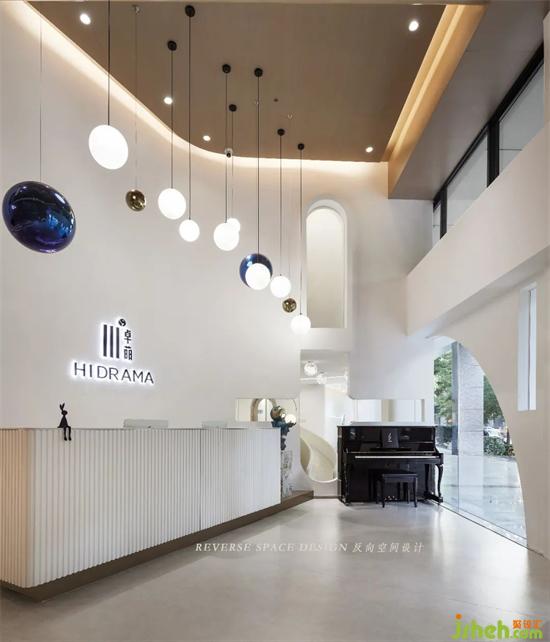 Blue planet, golden planet, white ball lamp, high and low scattered display, astronaut furnishings, rocket pictographic design, the front hall interspersing with multi-functional play area connected to the first floor, so that the whole space is full of children's fun and exploration interest.
