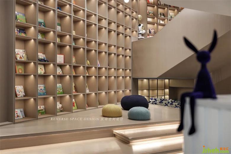 Shoe changing area, step drawing area, under the stairs bobo ball play area, the overall design planning, the design of a large multi-functional bookcase, visual shock, the sense of space pull full. Let children sit on the floor at any time and explore reading.