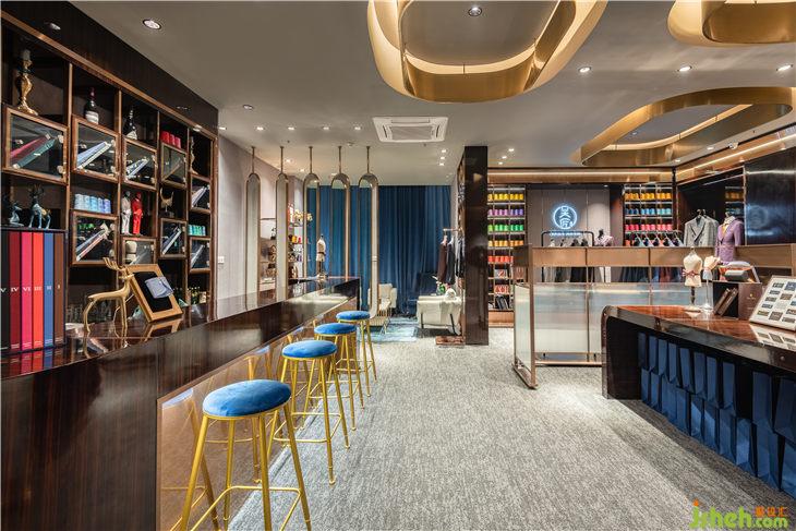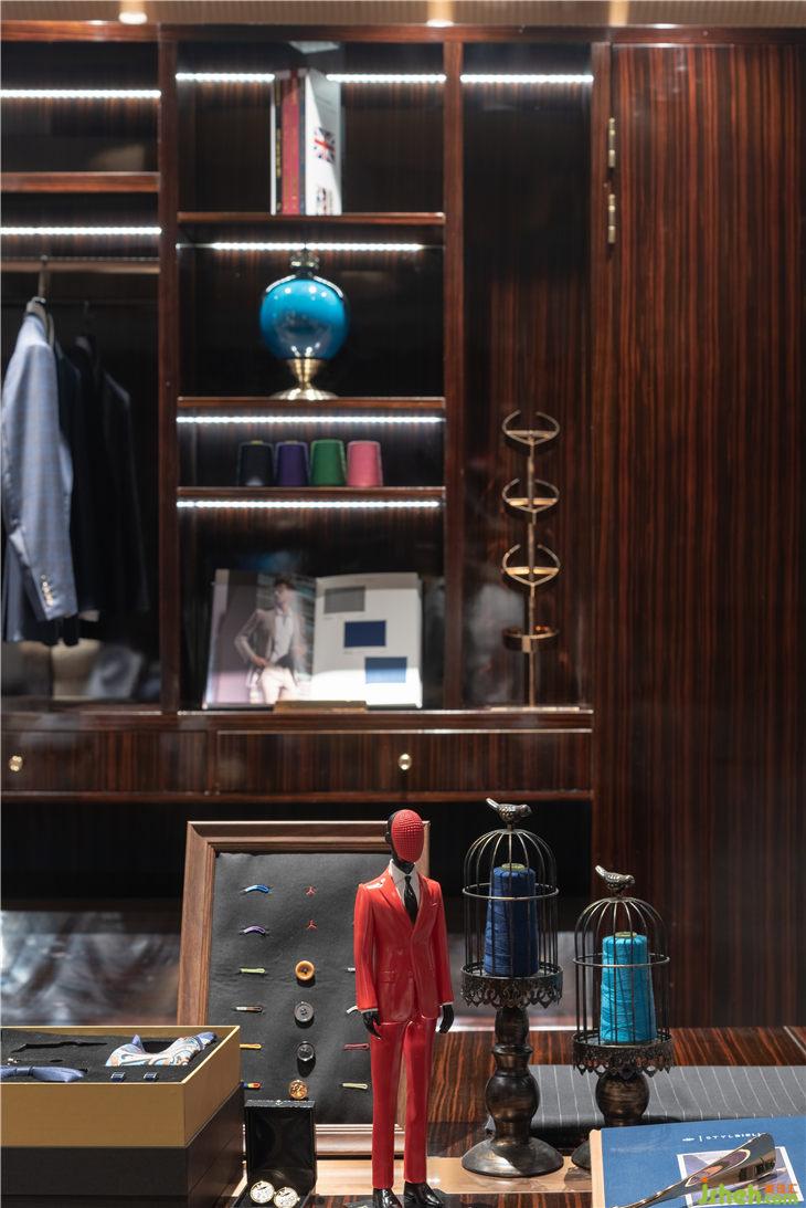 西裝店鋪內部展柜同樣以深色為主色調,內鑲式的展柜,使得空間感更加的整潔。金色的茶幾和時尚的深色沙發(fā),為單點的空間增添了幾分時尚感,在空間中適當的選用了金色作為裝飾,體現西裝定制的精致感。