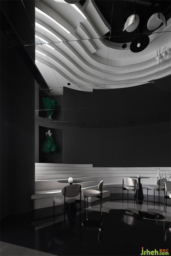 作為秀場的主題色,黑與白是永咖啡&酒吧復(fù)合空間設(shè)計不過時的經(jīng)典,結(jié)合當(dāng)代藝術(shù)思維進行空間的重塑。深與淺的色塊將冰山與水面區(qū)分,淺色的休息區(qū)是冰山的層層遞進,深色鏡面組成的地面成為深不可測的湖泊,形成了視覺上的空間對話。