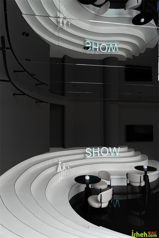 The fashionable show doesn't need much decoration. The white steps were given a natural curved arch shape, with clean lines outlining the cut shape of the iceberg, winding forward. The black lines traced the boundary of the steps and became a sign to draw the eye.