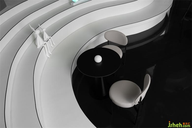 弧形吧臺結(jié)合品牌本身的理念和對自然環(huán)境的追求,延續(xù)了冰川的設(shè)計(jì),串聯(lián)起整個(gè)空間,增強(qiáng)畫面張力的同時(shí)豐富了視覺層次。
