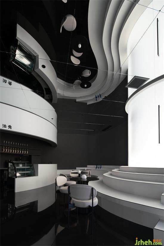 餐桌椅隨著空間的延伸,零星遍布在咖啡&酒吧復(fù)合空間設(shè)計(jì)黑色的“湖面”,靈動(dòng)開放的布局為社交留出足夠空間。
