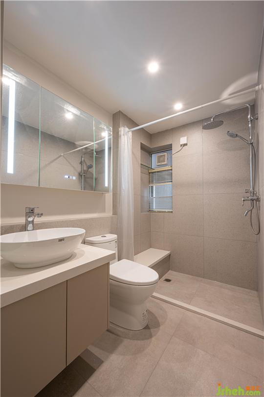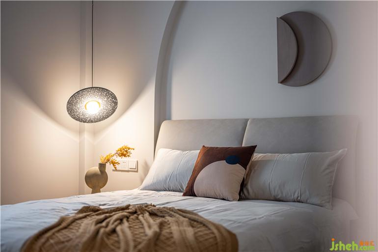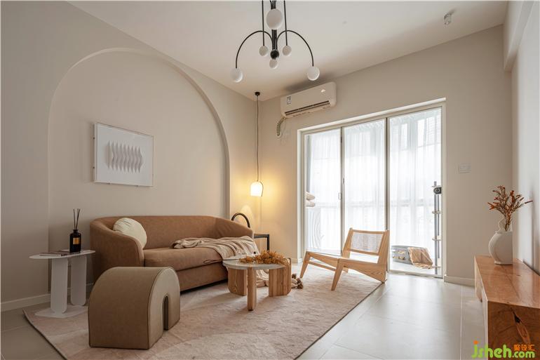 全屋都用了奶咖色的墻漆,通過(guò)暖光的營(yíng)造,整體出來(lái)更溫馨;墻身拱形并非為了做而做,實(shí)際原來(lái)是右側(cè)有一個(gè)凸出來(lái)的柱位,為了將柱隱藏又不影響緊湊的客廳空間面積,廣州舊改設(shè)計(jì)將柱子做成了拱形的對(duì)稱關(guān)系,包括把拱形和各種幾何的元素沿用到各個(gè)空間的軟裝上;客廳陽(yáng)臺(tái)之間使用了折疊落地窗的方法,平常打開(kāi)也可以是客廳的一部分,想晾曬的時(shí)候關(guān)上折疊窗,又可以成為臨時(shí)的生活陽(yáng)臺(tái)。