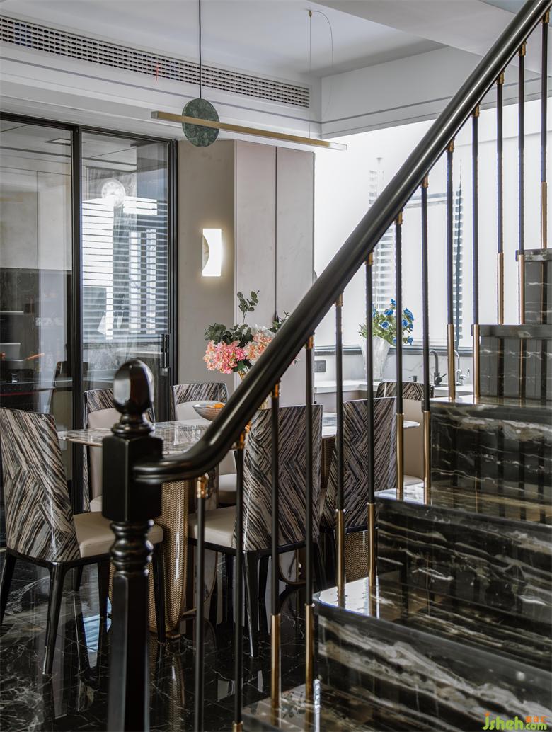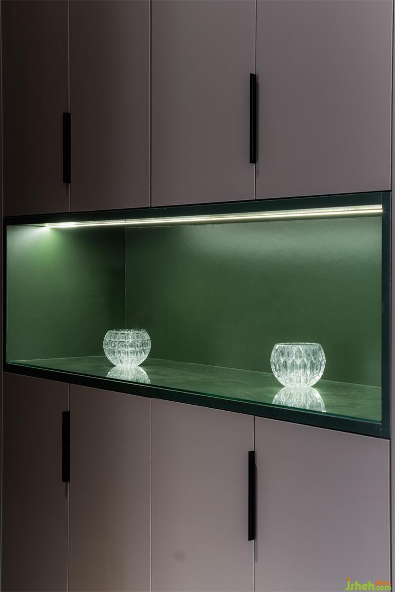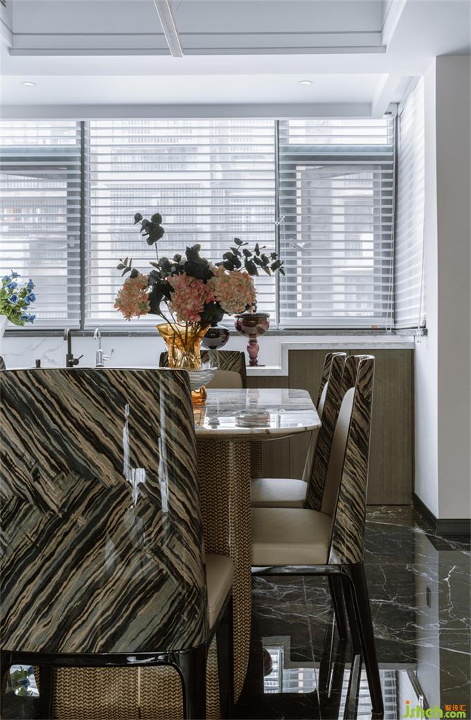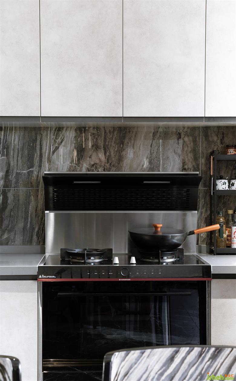 利用酒柜厚度彌補(bǔ)了餐廳與客廳抽線不水平,空間不方正的問題。斜角的設(shè)計(jì)讓空間變得活潑,有處理?;▓@家居設(shè)計(jì)增加的操作臺面大大提升了烹飪的時效。