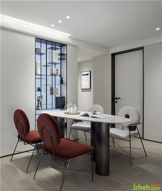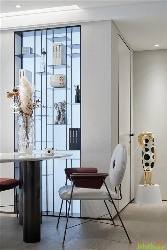 原始建筑結(jié)構(gòu)入門是一個(gè)無(wú)采光小空間餐廳,四周圍繞著5個(gè)門洞,空間體驗(yàn)狹小閉塞采光差。洛陽(yáng)家居設(shè)計(jì)中將全部可拆除墻體拆除,重新梳理空間布局和動(dòng)線,將客廳和小臥室對(duì)調(diào)位置,入戶有一個(gè)比較敞亮開闊規(guī)整的客餐廳空間,同時(shí)將過(guò)道也劃入整體空間,增強(qiáng)空間的體量感;將臥室后移,前后動(dòng)靜分區(qū);客餐廳過(guò)道整體考慮,打破常規(guī)布置方式,同時(shí)拆除部分與主臥隔墻加入通電玻璃,進(jìn)一步增強(qiáng)餐廳采光和通透感,通電玻璃的切換也可以滿足不同時(shí)間段的空間使用需求,以及增加視覺(jué)延伸感和通透感。