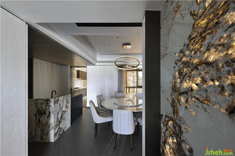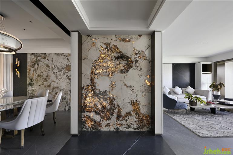 公共區(qū)域以玄關(guān)為界,隔而不斷,避免空間因?qū)掗煶叨葘?dǎo)致空泛。一塊形似“魚躍龍門”的大理石裝飾其上,以美好的寓意提升空間的人文內(nèi)涵,并奠定了空間輕奢的基調(diào)。