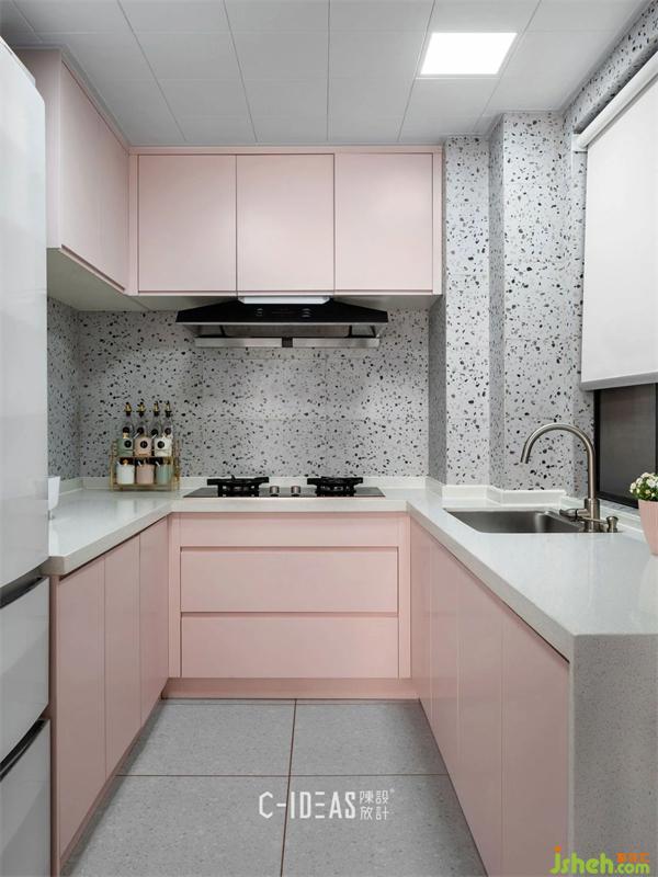 少女心粉色櫥柜+水磨石墻面+白色石英石臺(tái)面,整體絢麗甜蜜又溫馨。