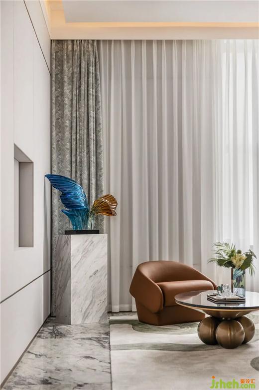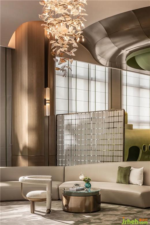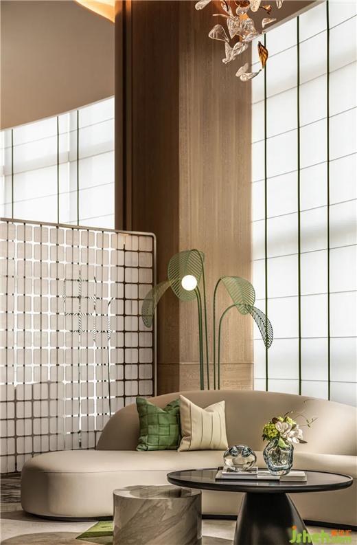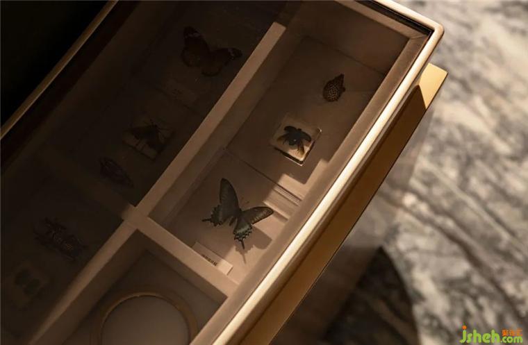 野竹分青靄,樹深時見鹿?;⌒紊嘲l(fā),封藏著各種蟲蝶的茶幾,闡發(fā)著生活的盎然樂趣。城市展廳設計以鹿的藝術裝置映襯,留駐在這城市綠洲,猶如漫步在林間樹下。為空間增添一抹輕快靈動,帶走了城市的陰霾。