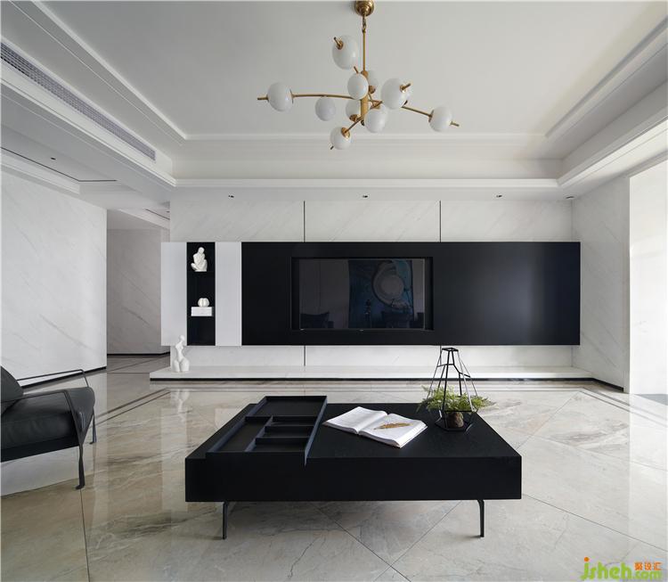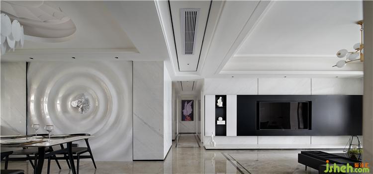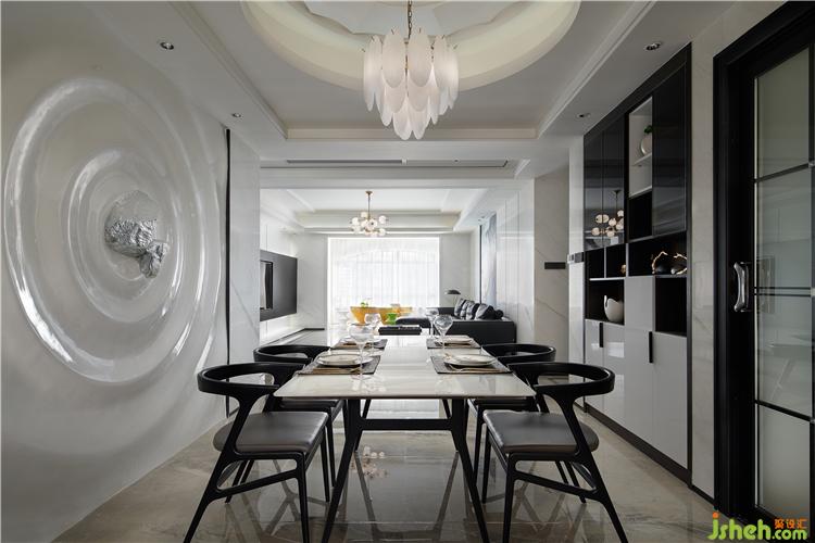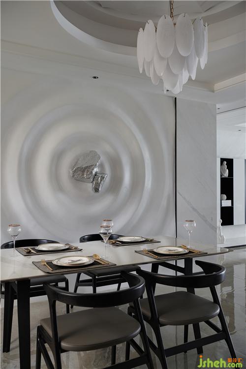 黑白灰的空間有著深邃的視覺延伸感,沙發(fā)背后精心挑選的手繪綴飾……色調(diào)柔和的背景鋪陳開來,在簡潔的黑白灰空間里,顯得份外恣意灑脫……餐廳的白色雕塑背景,若暈染開的水波,星光連綿,點綴著星夜,光芒圍繞……又似少女的螺髻,立體生動。光影纏繞間,交錯的線條刻畫著生活的豐富多變,同時中和了日常柴木油鹽的寡淡。不同的材質(zhì)在空間中相遇,奏著和而不同的生活樂章。