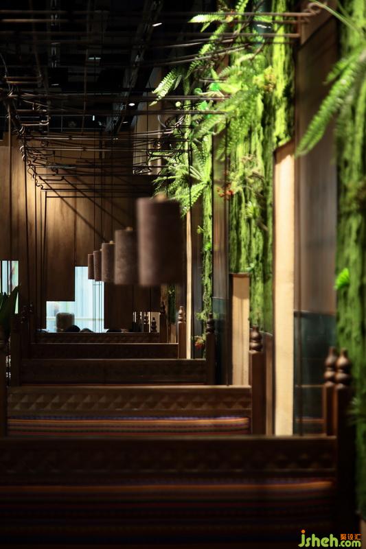 鐵藝的柱子有序的排列空間中,豐富了空間感,也營(yíng)造出若隱若現(xiàn)的私密感,柱子下燈光由下而上,增添儀式感。木、石、夯土構(gòu)成墻面對(duì)綠植墻進(jìn)行的分割,古樸的顏色和質(zhì)感,讓整個(gè)餐廳好似自然生長(zhǎng)于環(huán)境之中,氛圍自然而舒適。