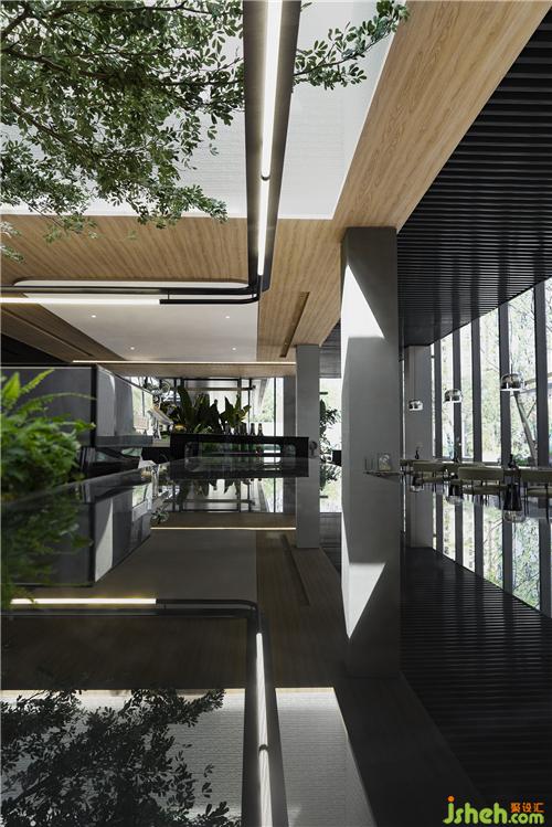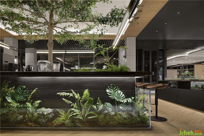 空間原本即有天井,設(shè)計(jì)巧妙利用了空間的這一基礎(chǔ)條件,將天光與自然之境引入室內(nèi)。圍合的吧臺(tái),創(chuàng)造一處視覺焦點(diǎn),成為一處人群休閑聚集的場(chǎng)所。