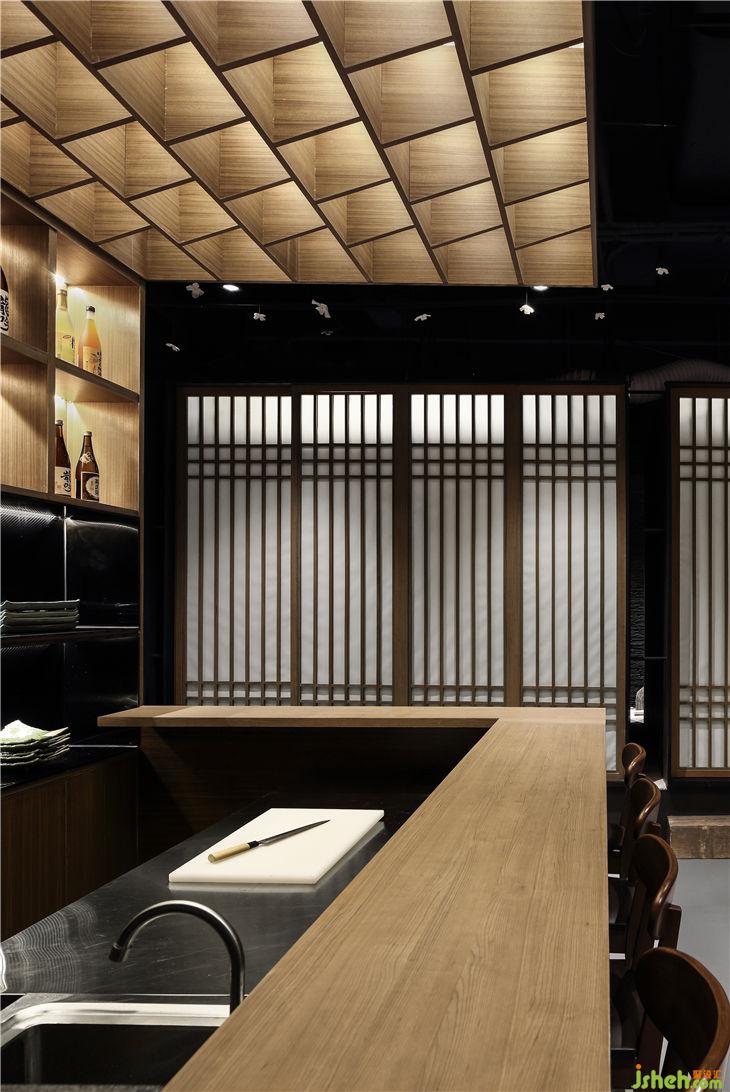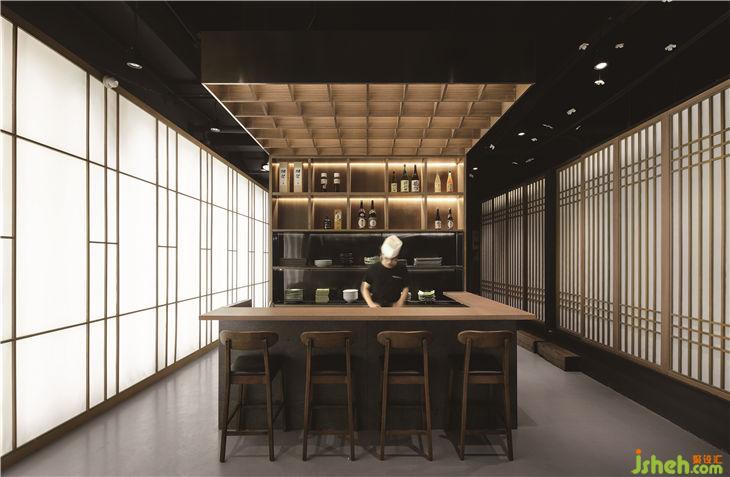 方案始終以精神層面的構(gòu)建為核心。設(shè)計(jì)者迫切的向空間索取簡(jiǎn)潔的符號(hào)語(yǔ)言,是為一面尋求裝飾的減法設(shè)計(jì),一面遵循日本隱忍美學(xué)的克制情感。其中中廳連接著明檔水吧臺(tái),均由一種手法的木作頂棚勾勒出功能之間的關(guān)聯(lián),在家具及造型的尺度上也集中體現(xiàn)了克制背后的包容。包間環(huán)繞中廳,是五個(gè)與原有墻面退讓600毫米的木盒子,每個(gè)盒子三面封閉,剩余的一面讓視覺開放,直面連續(xù)而精巧的景致。只有合上門,掀起簾,便可滿足占有的欲望,在隱私中審視山水。