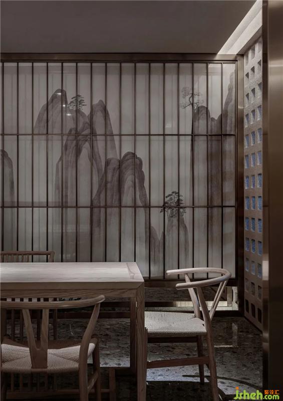 隨之撲面而來(lái)的是設(shè)計(jì)中以當(dāng)代手法將山水、自然和光影結(jié)于一庭,整個(gè)空間由一幅美輪美奐的長(zhǎng)廊絹紗定制的水墨山水畫(huà)卷串聯(lián)起來(lái),經(jīng)典的符號(hào)、現(xiàn)代的工藝、清雋簡(jiǎn)潔的藝術(shù)與文人雅士的生活場(chǎng)景交疊融合,寥寥數(shù)筆,東方的清雅與靈逸緩緩而入。