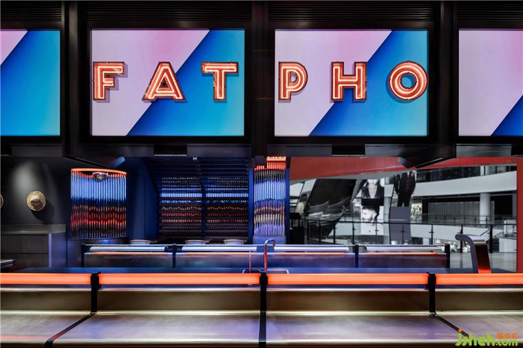 燈箱上循環(huán)播放著品牌的卡通形象,一個戴著斗笠拿著PHO的skater boy。杭州餐廳設(shè)計作為品牌設(shè)計的延展元素,靈動的畫面內(nèi)容讓食客在進餐時與FATPHO大發(fā)品牌建立更深層的聯(lián)結(jié)。