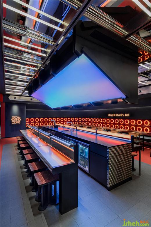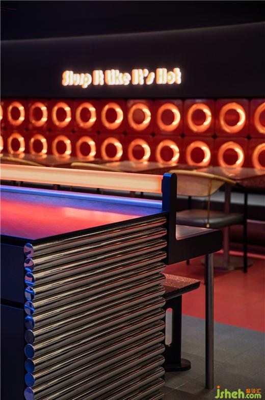 幾大體塊之下呈現(xiàn)出物理空間的張弛與力量,迷幻沖撞的光色變化附著在不同形態(tài)上,杭州餐廳設(shè)計奠定了品牌空間的印象基調(diào)。
