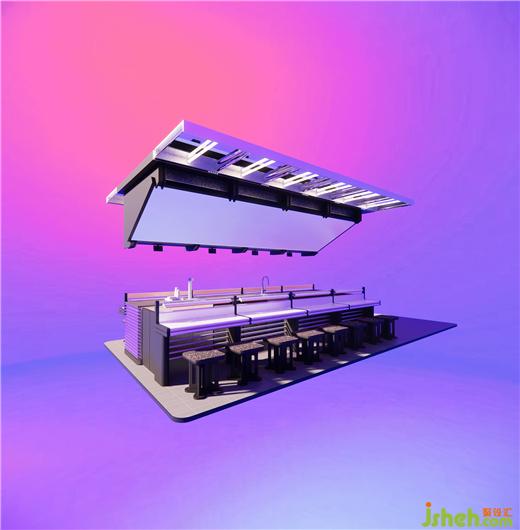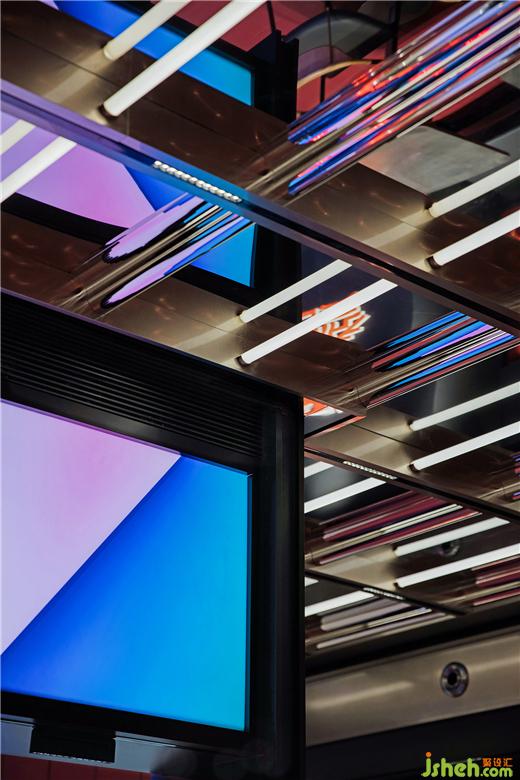 智能燈箱無疑是空間中的視覺焦點和引流王者。借鑒電影《銀翼殺手》中賽博朋克的典型藍紫色系,杭州餐廳設(shè)計用朦朧過度的動態(tài)漸變效果引導(dǎo)視線的落點。