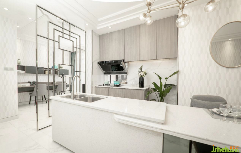 開放式空間設計,令書房、廚房、餐廳、客廳四區(qū)一體化,設計師靈活地利用空間布局,劃分各區(qū)的功能性作用,增加了儲物功能,使得空間看起來非常整潔干凈。而且整體米白色色調(diào)為鋪墊,金屬材質(zhì)點 綴,營造一種輕盈透亮的時尚感,不失個性,兼具品味與高貴。