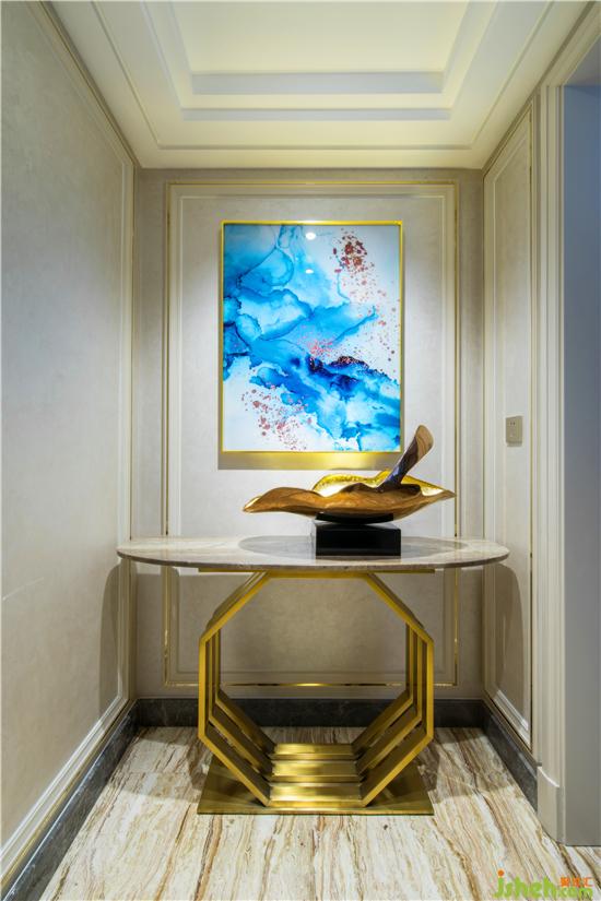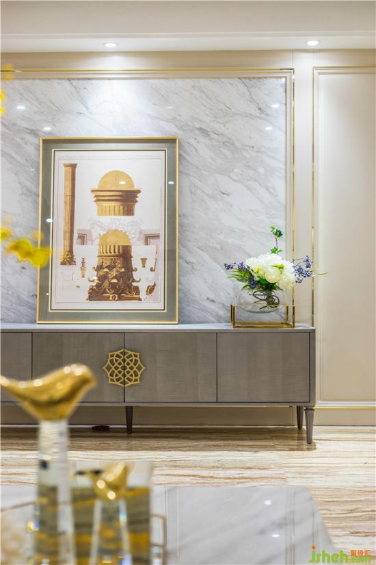 生活中的雅致與浪漫是主人一直推崇的一種生活放式,全房地面采用大理石材質(zhì),石材的光澤填補了本戶型自然采光不足的缺失,墻板的木質(zhì)肌理搭配金色銅條,視覺上恰到好處的營造出精致時尚的優(yōu)雅魅力。裝修公司