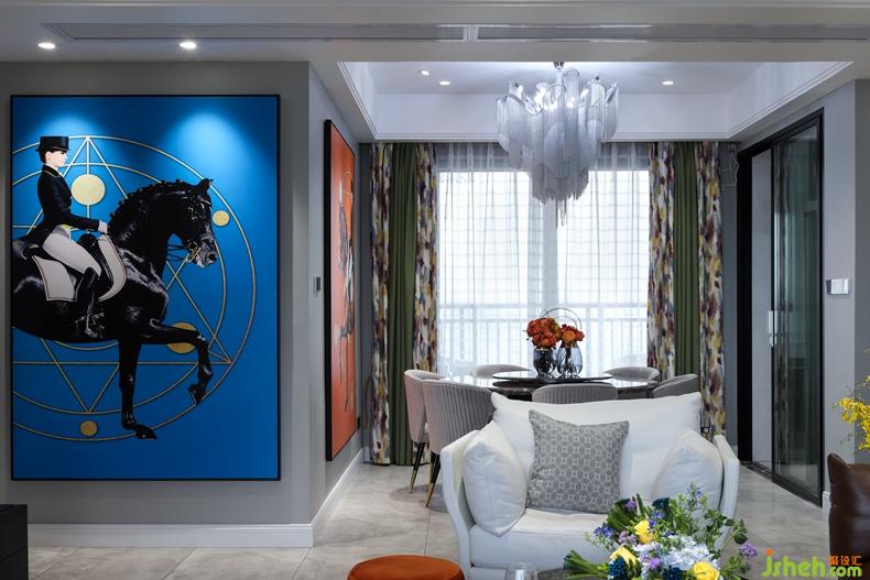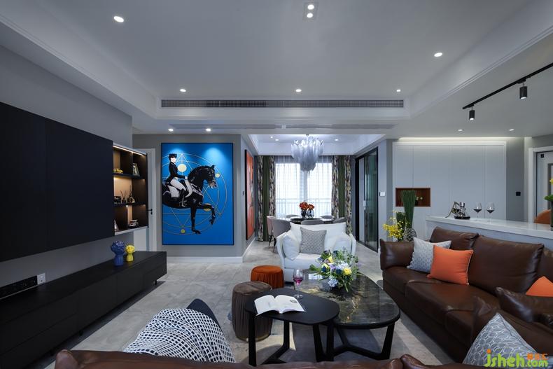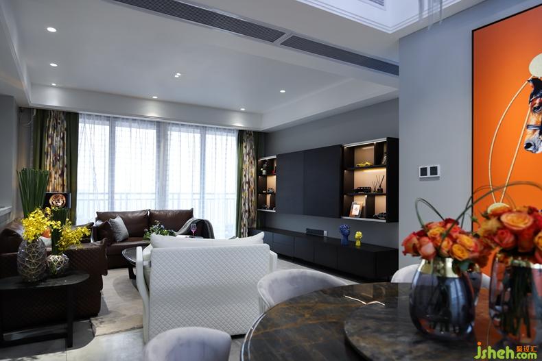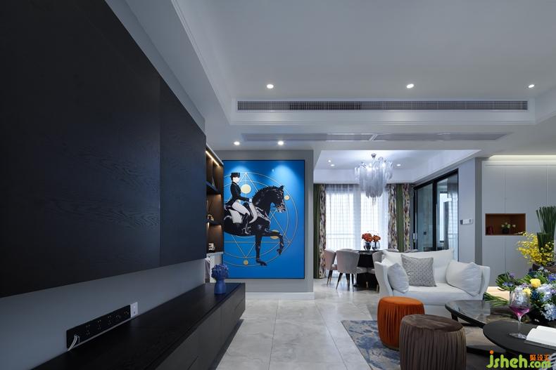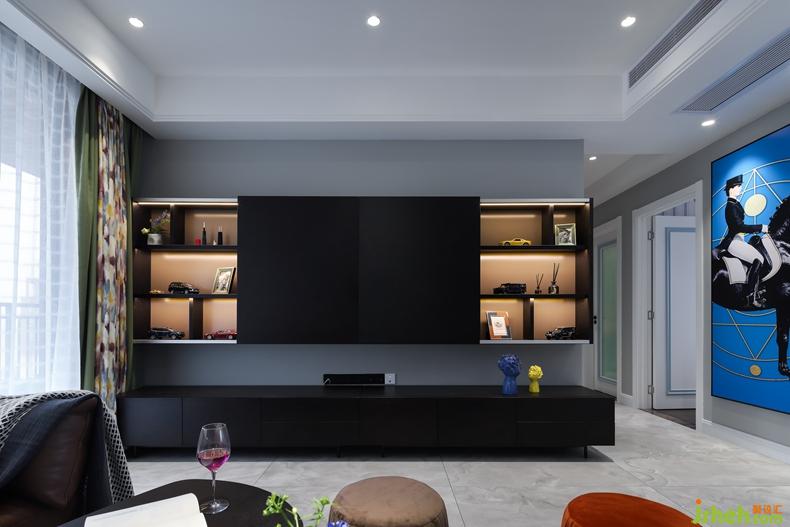 客廳硬裝簡單;室內設計師天花做無主燈設計。分布在空間各角落的小光源,共同渲染出一個柔和、明亮的空間。黑白灰為主色調的空間,搭配多彩的飾品,提高空間顏值。