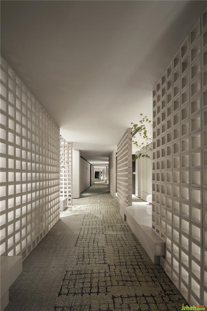 客房過道區(qū)域,設(shè)計(jì)師大膽地提出客房內(nèi)退的形式,犧牲客房的空間,以迂回式的入門儀式,通過門口的景觀、屏風(fēng),不同組合方式圍合出獨(dú)立小庭院,與外界隔絕,構(gòu)成廊道街區(qū)效果,制造美好的體驗(yàn)感與私密性