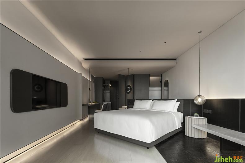 標(biāo)間吊頂造型致敬經(jīng)典的建筑元素,用半弧的建筑體塊去塑造頂面,使空間“建筑感”十足,硬裝的柔和與硬朗形成對(duì)話