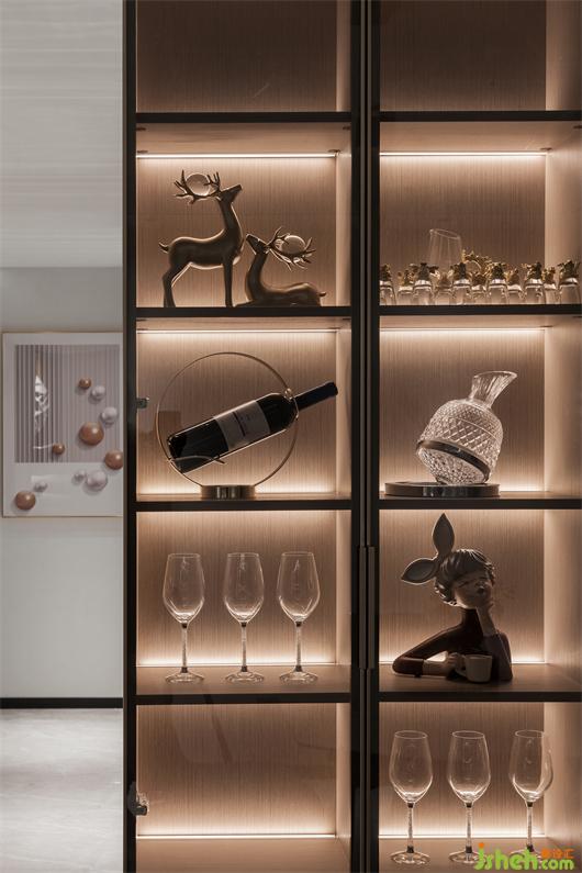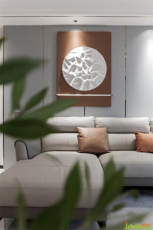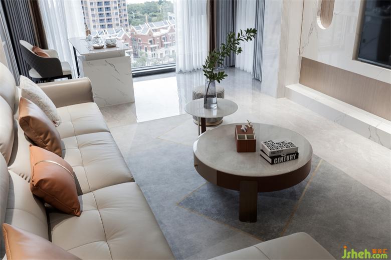 魚肚白巖板電視背景與溫潤(rùn)柵格木板的有機(jī)組合,以材質(zhì)的碰撞出“美”的樣性。