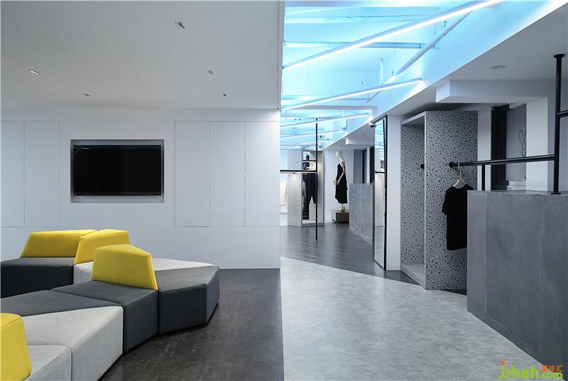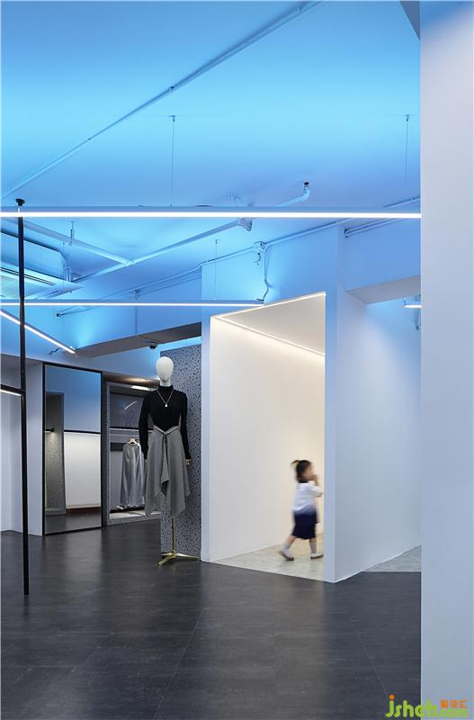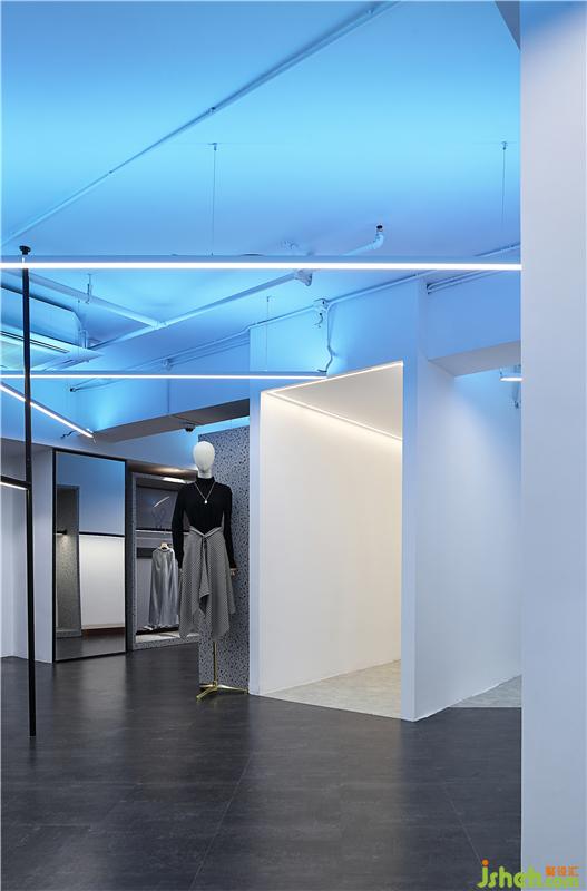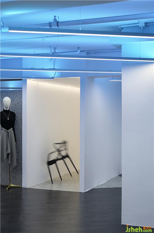 與試衣間鄰近相隔設(shè)有一條狹長的矩形通道,設(shè)計師亦是運用了景觀設(shè)計之中移步換景的方法,賦予其蛻變之道的魂魄。