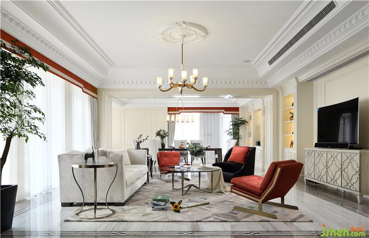 寬敞的起居室由米白色的墻板包層,同時還有一些定制的展示柜,將跳躍的橙色單椅、淺灰地毯以及干凈的白色布藝融合在一起。一旁的餐廳里,深色的胡桃木桌和布藝餐桌凳使得餐廳看上去高雅而干凈,加上做舊而狹長的吊燈點綴,更顯得別致。別墅裝飾