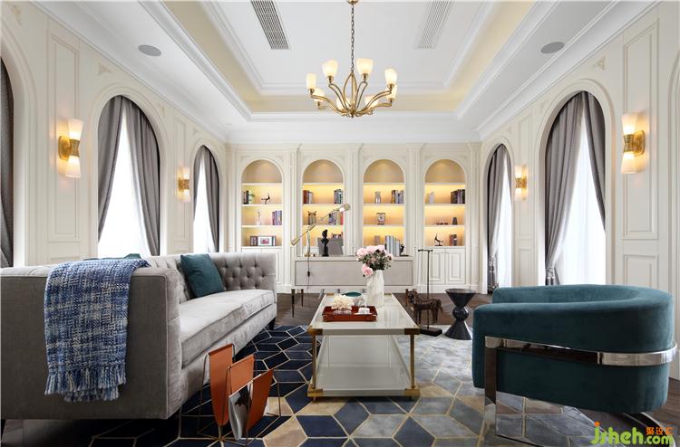 為第二代人打造出寬敞的會客閱讀和睡眠空間,兩面落地的窗戶有一個很好的視覺通透感,延伸到不同區(qū)域抑或是戶外景觀,在這樣下,陽光也忍不住偷偷溜進來瞅一眼。兩面分割的圓弧形的窗戶預(yù)留出的窗簾盒子,形成了一處兩面看景呼吸,別致的古典手法打造的景觀分割。這里是關(guān)于藍色的溫度,漸變的灰藍色主題地毯是整體空間基調(diào)的延伸,而點綴的藍色、墨綠的軟裝陳設(shè)則與灰度相當(dāng)?shù)拇竺娣e空間形成強烈對比。別墅裝飾